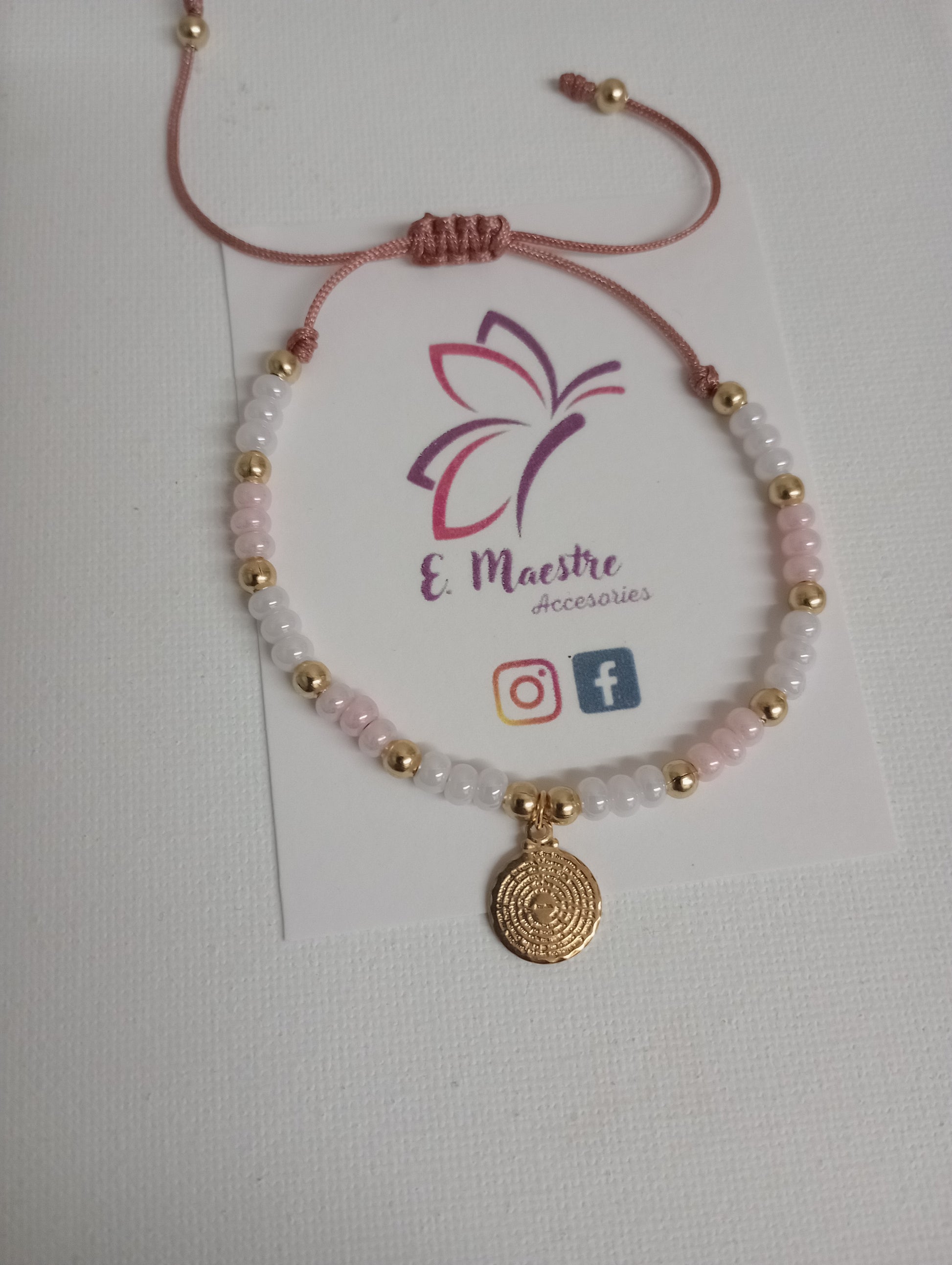 Pulsera en hilo, sead beads rosa y blanco, separadores baño en oro y medallita de padre nuestro en baño de oro.