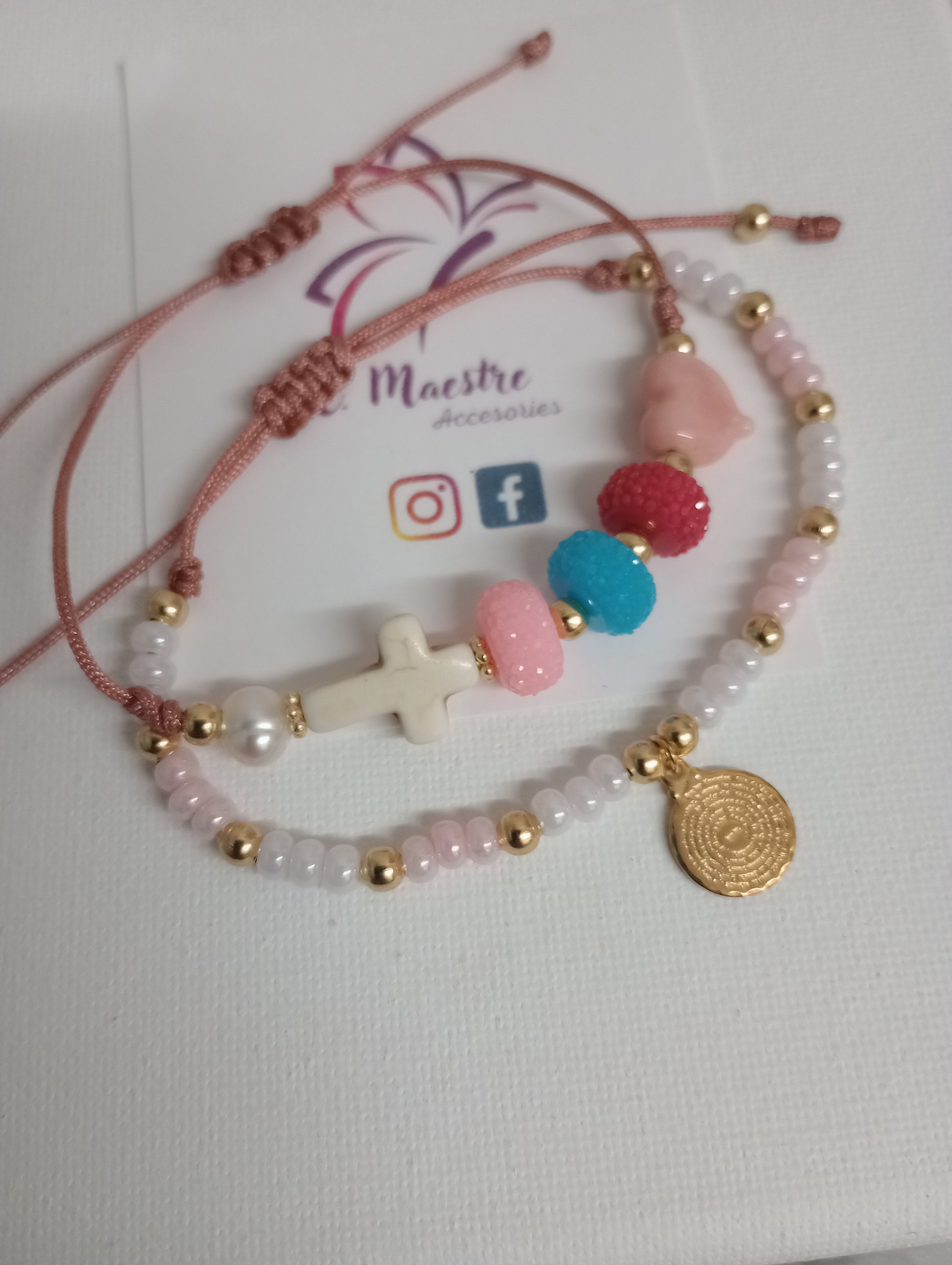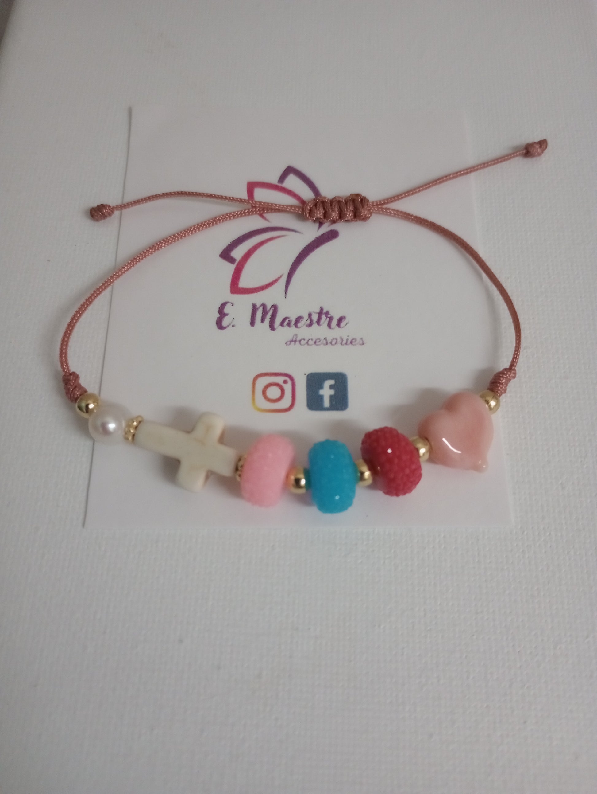 Pulsera en hilo, tiene perla, cruz turquesa ,cristales con brillo y corazón porcelana.